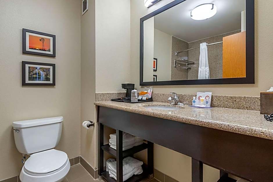 Wider doorways, a raised toilet seat, and a bathroom with grab bars are featured in this wheelchair-accessible suite.
